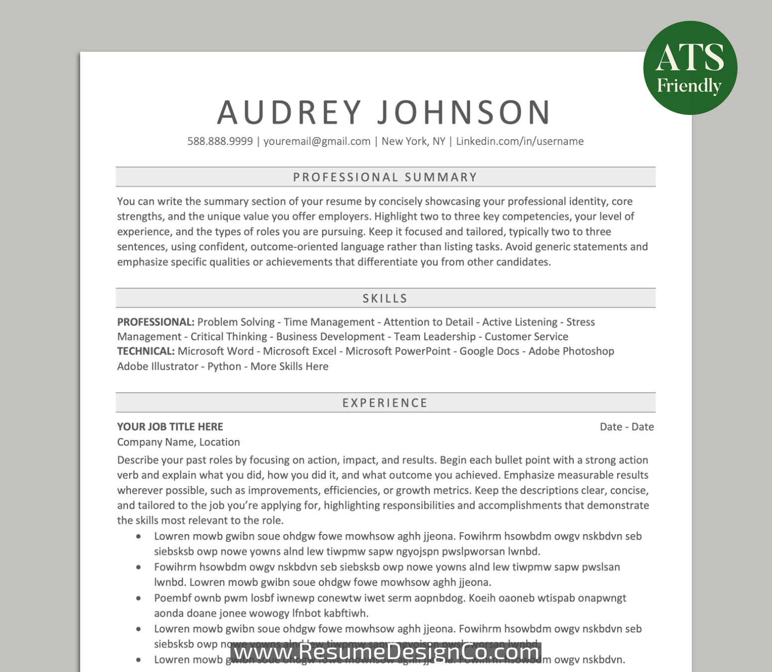 ATS Resume Template for MS Word, Professional ATS Resume Template, Clean Resume Template, Simple Resume Design, CV Format: Audrey Resume